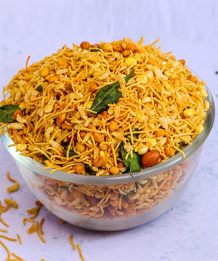 A crunchy mix of sev, nuts, boondi, and spices